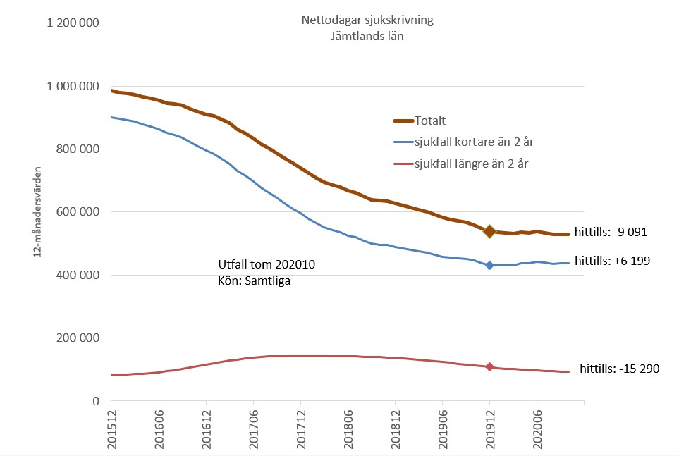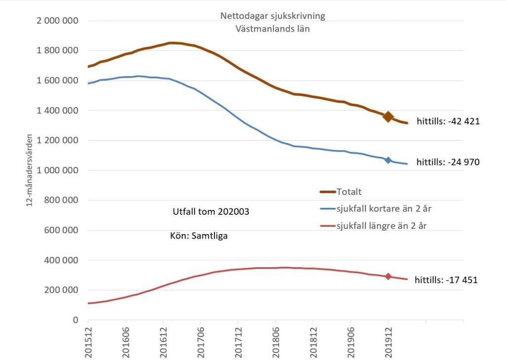 Med utfall per mars är det så att utvecklingen traskar på med en minskning som för året skulle kunna uppgå till 1,5 miljoner sjukskrivningsdagar netto.