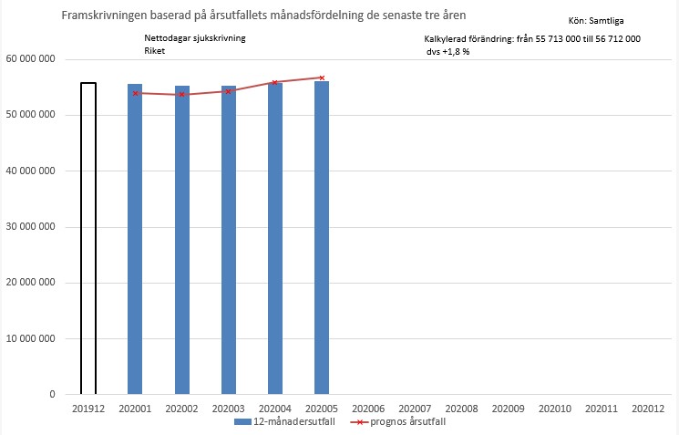 Återkomma får också Försäkringskassan. I sin senaste prognos (daterad 2020-05-04) redovisade man en trolig minskning av sjukskrivningsdagarna på nivån 4%. Fast då hade man inte tillgång till april-utfallet. Så nästa prognos (i juli?) lär göra en radikalt annorlunda bedömning.