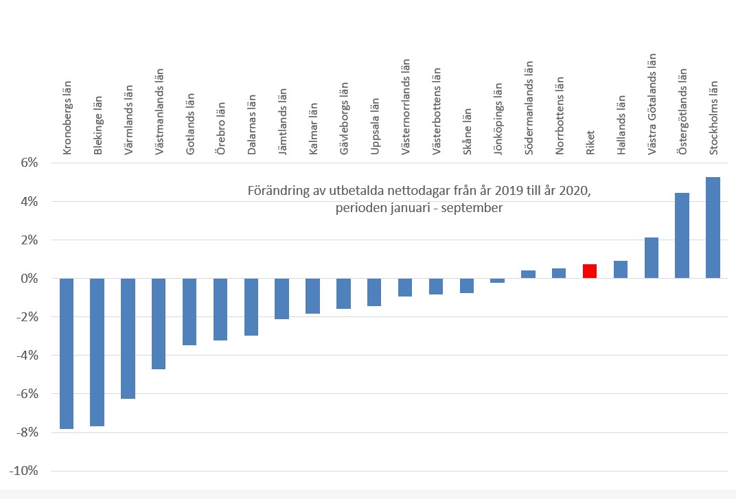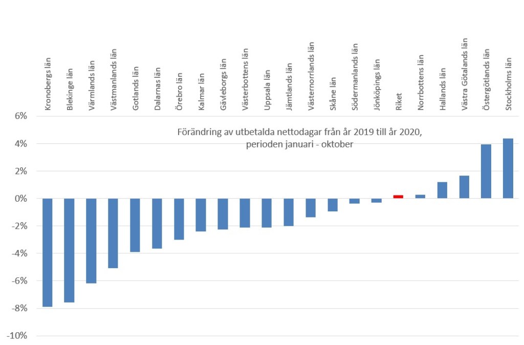 Lika spännande är kanske att det, trots pandemin, finns län som rätt kraftigt minskat sina dagar. Obs att här pratar vi utfall, dvs konstaterade fakta.