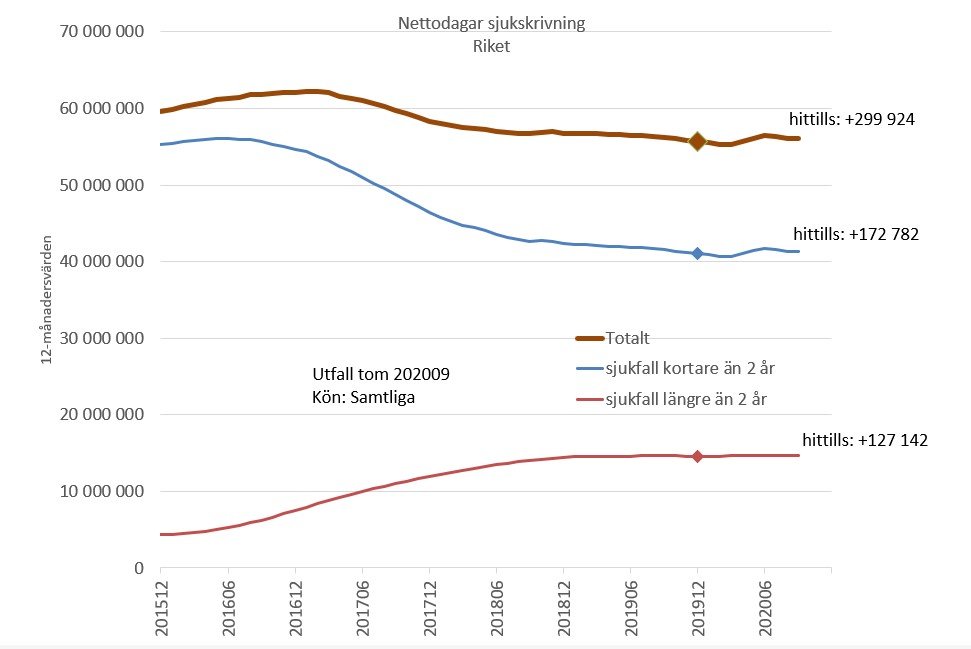 Länge har det varit så att minskningen på totalen har berott på att dagarna i korta sjukfall har minskat mer än dagarna i långa sjukfall har ökat. Pandemin har medfört att nu är det inte längre så. Visserligen finns det en marginell minskning av dagarna i de kortare sjukfallen, men den räcker inte alls till att väga upp ökningen av dagar i de långa fallen.