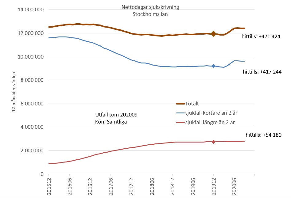 Dagarna i korta (<2 år) sjukfall har totalt ökat med 674 tusen. Stockholm ensamt har ökat med nära 441 tusen. Det är 2/3 av hela ökningen i Riket.
