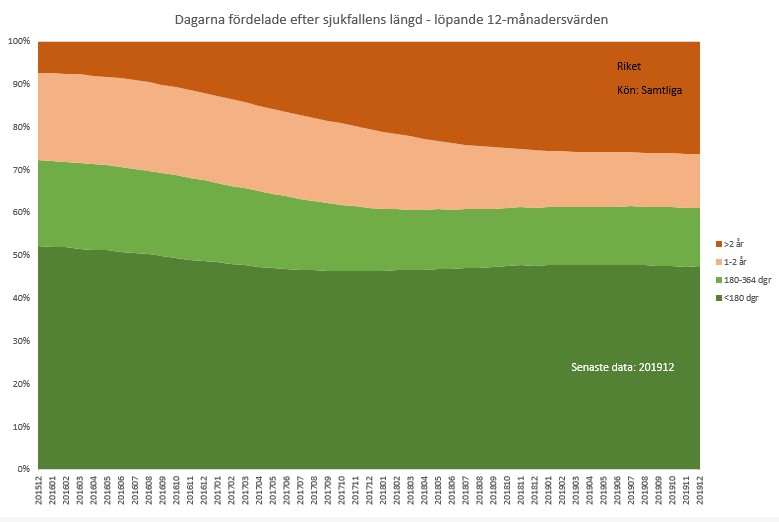 Den starka ökning vi sett av de långa (>1 år) sjukfallens andel av dagarna har avstannat. Titta på det övre ljusgröna fältet. Dess gräns mot de längsta sjukfallen är närmast horisontell.