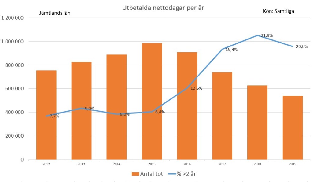 Skillnaderna uppstod inte precis nu. Jämtland har ganska länge haft en speciell utveckling. Här minskar dagarna i både långa och korta sjukfall – och alldeles särskilt i de långa sjukfallen.