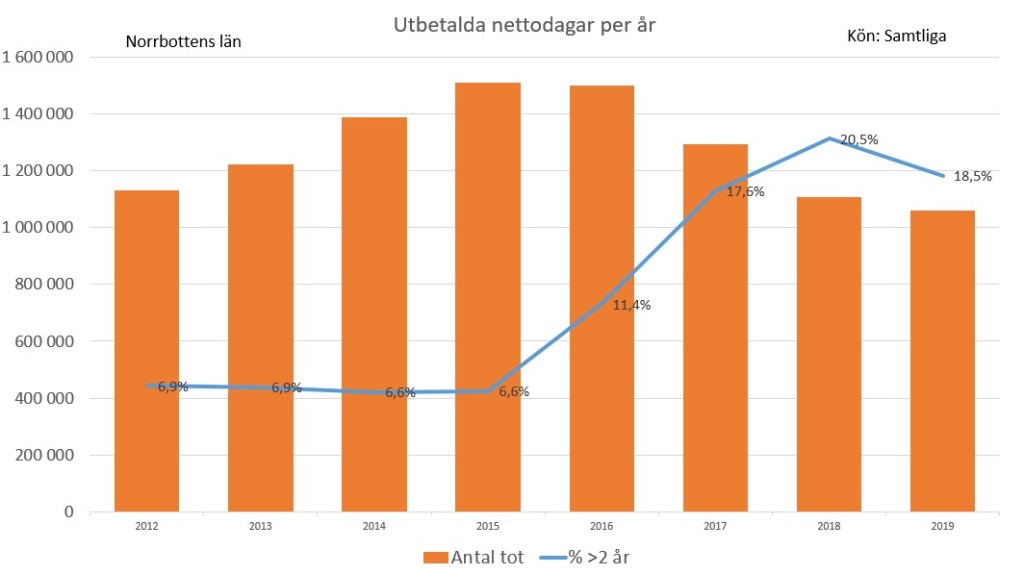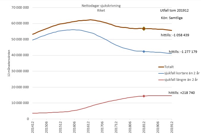 Den undre kurvan visar dagar som betalats ut i fall längre än 2 år. Den har visat ökning under lång tid, men nu ser det mer ut som en platå. Minskningen av dagarna i de kortare sjukfallen fortsätter och därmed minskar det totala antalet utbetalda dagar.