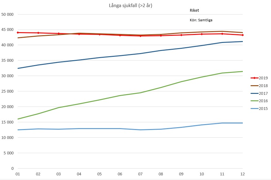 De där orimligt långa sjukfallen (>2 år) har tenderat att öka, men sedan 2018 har nivån stabiliserats. Också under 2019 har antalet legat strax under 45 000.